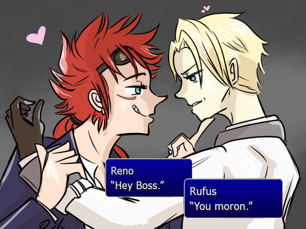 Nicknames:Reno often calls Rufus "boss", but sometimes calls him babe, or even doll when they're alone.