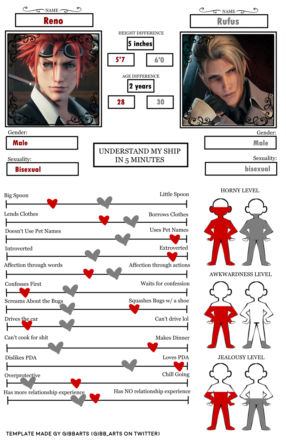 Reno likes to lay his head in Rufus' lap when Rufus insists that he takes a break. Rufus, meanwhile can be grabby and demanding when Reno isn't paying enough attention to him.
